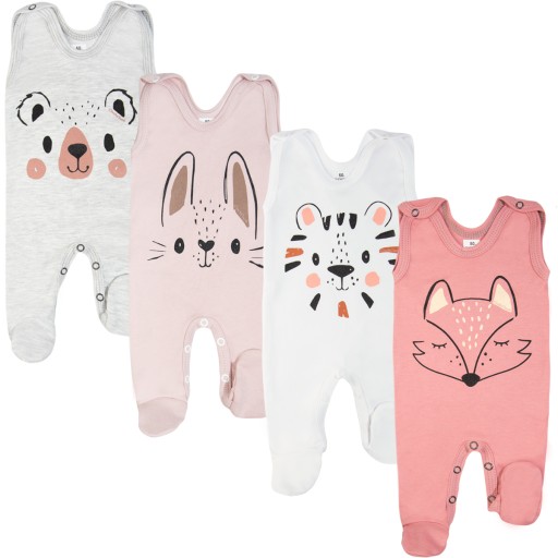 Doskonałej jakości śpiochy rozpinane w kroku - zestaw czterech sztuk gładkich śpioszków z uroczymi nadrukami.