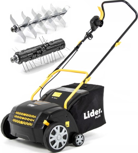 Lider Plus KCW1400 2w1 to wertykulator i aerator elektryczny w jednym! Posiada dwa wymienne wałki robocze do napowietrzania i nacinania trawnika.