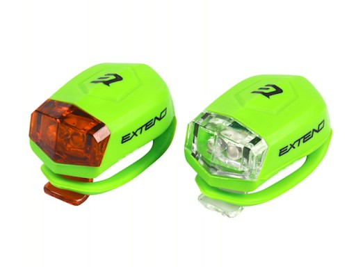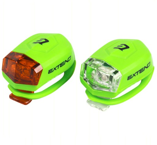 Komplet lekkich, silikonowych lampek rowerowych wyposażonych w uchwyty montażowe umożliwiające natychmiastowe użytkowanie.
