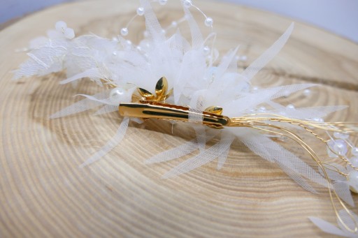 zdobiony tiulowymi kwitami osadzonymi na spince