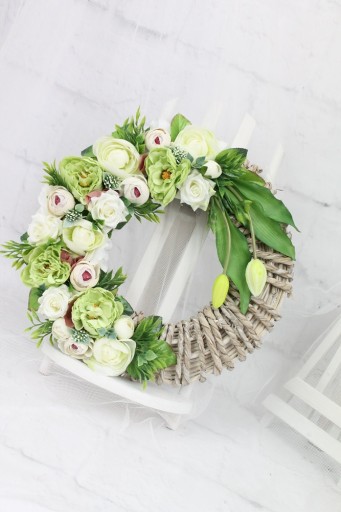 Wiosenny wianek wiklinowy oplatany sznurkiem o średnicy 35cm udekorowany kwiatami tulipanów, róż, anemonów, pełnika i peoni.