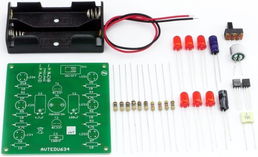 Elementy zestawu pozwalają zbudować interesujący efekt świetlny. Umieszczając moduł w pobliżu głośników diody LED będą migać w takt odtwarzanej muzyki. Dzięki zastosowaniu czułego mikrofonu układ nie wymaga żadnego podłączania do sprzętu nagłośnieniowego.