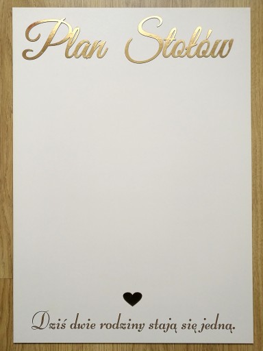 Napis Plan Stołów oraz serduszko są w kolorze złotym lub srebrnym (do wyboru), natomiast dolny napis jest wygrawerowany.