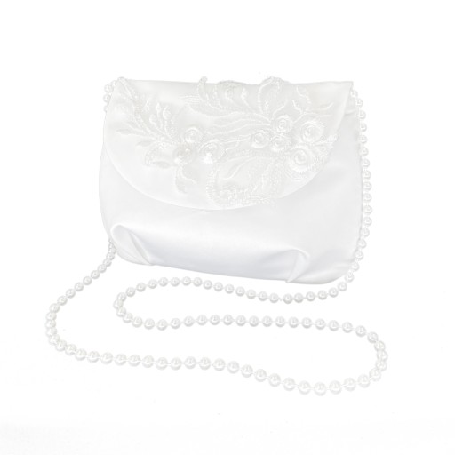 Torebka wykonana z gładkiej, białej, półmatowej satyny. Ozdobiona piękną koronkową aplikacją.