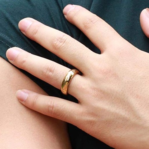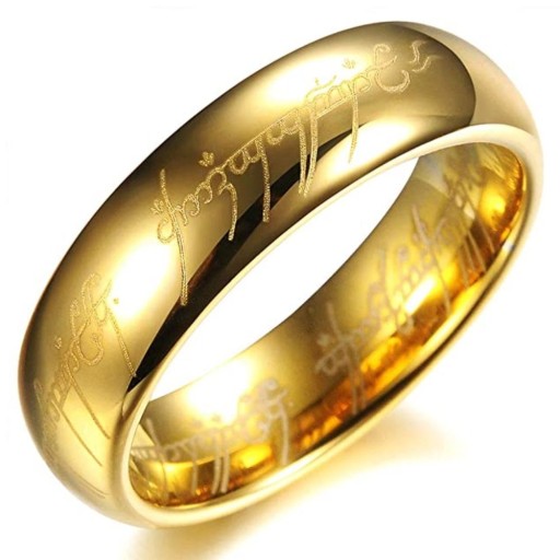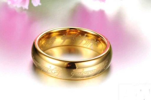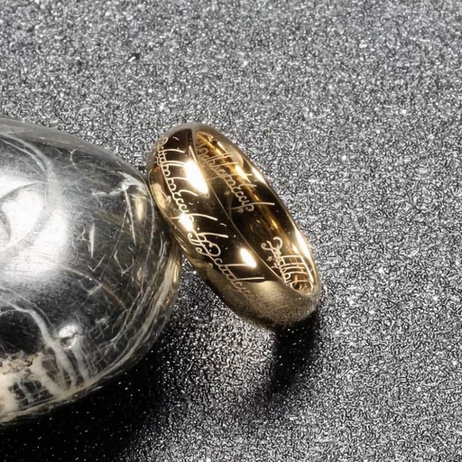 Stylowa obrączka wykonana z wysokiej jakości węgliku wolframu, który charakteryzuje się niezwykłą twardością oraz odpornością. Na zewnętrznej jak i wewnętrznej stronie obrączka posiada laserowo wygrawerowany motyw z filmu Władca Pierścieni. Zewnętrzna jak i wewnętrzna powierzchnia produktu jest wypolerowana, o wysokim połysku i błyszczącym wykończeniu. Kolor złota zawdzięczany jest anodowaniu trwałą metoda Ion Plating, która pozwala cieszyć się powlekaniem bez obaw o jego starcie. Obrączka cechuje się łagodnie zaokrąglonym profilem oraz soczewkowym wnętrzem, które zwiększa komfort i wygodę przy użytkowaniu. Niespotykany, unikalny wzór zwracający uwagę, który będzie świetnym dodatkiem zarówno do codziennej, jak i wyszukanej stylizacji dla miłośników The Lord of the Rings.