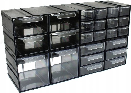 W zależności od modelu, wnętrze modułów jest podzielone tak, że można w nie włożyć dwie, cztery, sześć lub dwanaście szufladek. Dodatkowo najmniejszą szufladkę można podzielić na trzy części z pomocą dodatkowych przegródek (do kupienia oddzielnie).