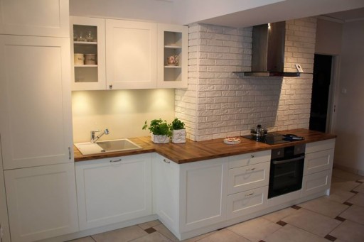 Nasza trzecia propozycja to połączenie elementów ze starej cegły z płytkami ceramicznymi. Takie połączenie nowoczesności z klasyką, gdzie dominuje biała ceramika, efektownie połyskująca glazura oraz błyszczące szafki to świetna okazja do tego, by stworzyć nietuzinkowe wnętrze w stylu retro.