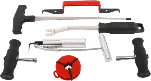 Uniwersalny zestaw do wycinania szyb samochodowych(każda marka), składa się z siedmiu elementów zapewniających prawidłowe przeprowadzenie zabiegu wycinania szyby.