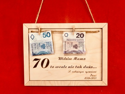 Cena produktu zawiera ramkę oraz sznurek jutowy i klamerki. W produkcie nie ma banknotów.