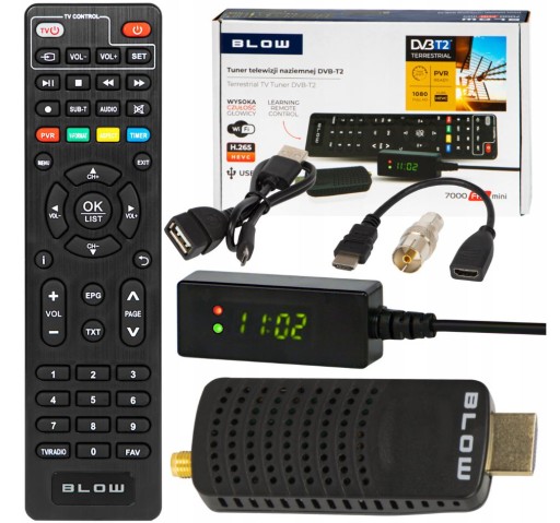 Nowy tuner dekoder cyfrowy DVB-T2 H.265 HEVC BLOW model 7000FHD mini kolor czarny , Wyświetlacz z odbiornikiem IR , Pilot zdalnego sterowania , Przedłużka HDMI , Kabel USB , Adapter antenowy , Taśma dwustronna ( do montażu wyświetlacza na obudowie TV ) , Oryginalne opakowanie BLOW AUDIO Instrukcja obsługi w języku Polskim