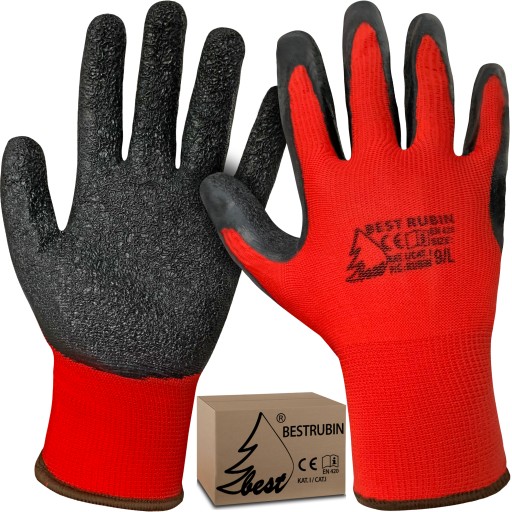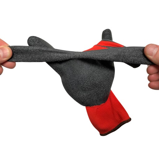 Rękawice ochronne ; czerwony poliester powlekany ryflowanym lateksem w kolorze czarnym.