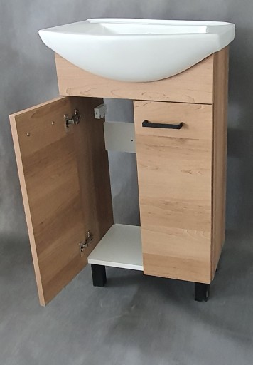 ✅Szafka łazienkowa z umywalką o szerokości 46cm wykonana z bijącej rekordy popularności płyty w odcieniu dąb tabaco.
