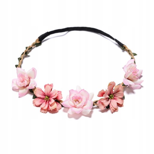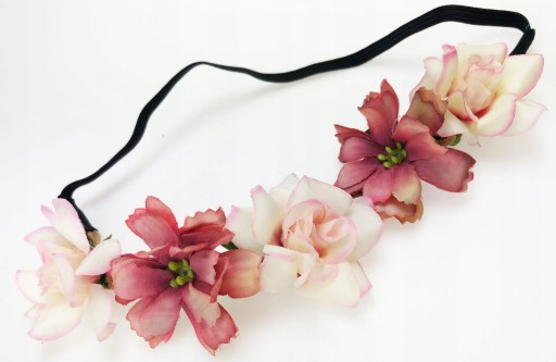 Opaska ozdobiona delikatnymi kwiatuszkami i materiałowymi listkami, dzięki czemu wianek ma bardzo naturalny design.