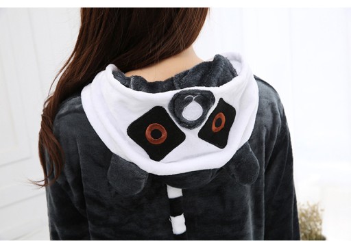 Biało- szare kigurumi przedstawiające postać Króla Juliana z filmu animowanego "Pingwiny z Madagaskaru" z długim, prązkowanym ogonem to doskonały strój na udaną imprezę ze znajomymi, bal karnawałowy, wygodny dres do domu, czy ciepła piżamka na chłodne wieczory! Kigurumi ma wiele zastosowań, dzięki temu, że wykonane jest z wysokiej jakości mikrofibry, która jest ciepła, bardzo miła w dotyku oraz delikatna dla skóry,a także bardzo wytrzymała jeśli chodzi o częste pranie. Wygodne zapięcia- guziki, luźny krój, ściągacze przy rękawach i nogawkach sprawiają, że w takim kombinezonie będziesz czuć się bardzo wygodnie i swobodnie, ponieważ nie krępuje ruchów. Świetny pomysł na prezent okolicznościowy. Spraw uśmiech najbliższym obdarowując ich kombinezonem LEMURA ! Na pozostałych naszych aukcjach znajdują się inne rozmiary i modele. Zapraszamy do zakupów!