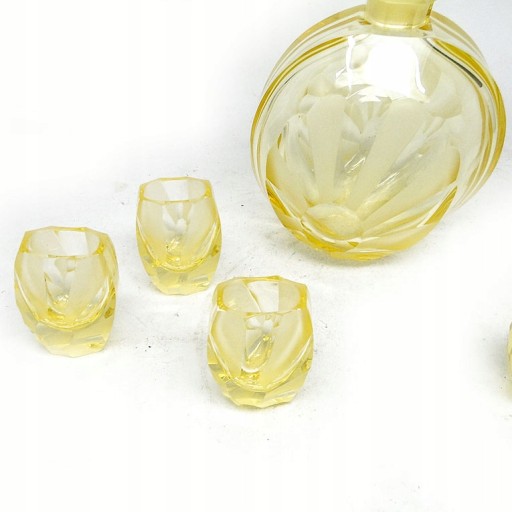 WIELKI cytrynowy zestaw likierowy składający się z karafki wykonanej ze szkła szlifowanego oraz sześciu kieliszków w stylu Art Deco.