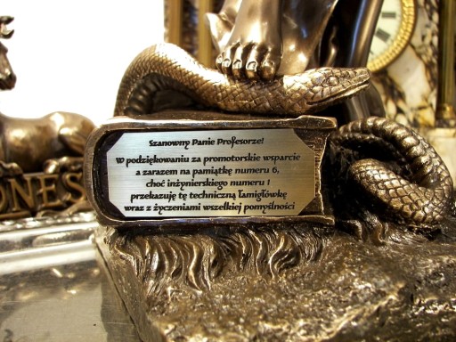 dedykację można by zrobić na płytce z laminatu grawerskiego i przytwierdzić do cokołu, jest wprawdzie niezbyt równy, ale zmieści się tam płytka o szerokości około 1,5 cm i dł 16 cm, to sporo. Popatrz na zdjęcia, są też inne propozycje