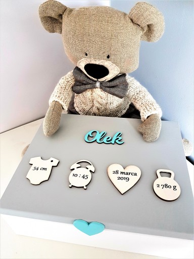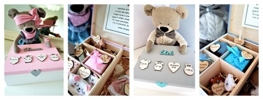 UWAGA ! W przypadku braku wyboru koloru pudełka nadamy pudełko szaro-białe z różowym bądź niebieskim akcentem w zależności od płci dziecka.