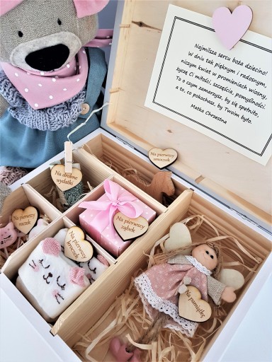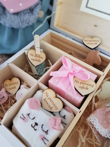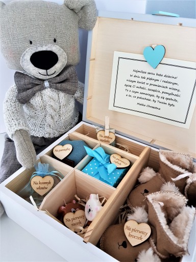 Zamieszczone na zdjęciach w przegródkach gadżety (np. skarpetki, świeczka, smoczek, pieniądze itp) nie są na sprzedaż są jedynie przykładem zawartości przegródki. Znajdujący się w tle misiu na zdjęciach także nie jest ofertą sprzedaży - jest tylko elementem dekoracji do zdjęcia.