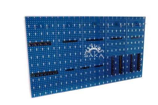 5.) Zestaw 5 blaszanych płyt perforowanych o grubości 0,8 mm, wymiarze całości 1125X505X15 mm (szerokość x wysokość x głębokość-rant) malowanych metodą proszkową na kolor szary, czarny, czerwony lub niebieski oraz komplet 22 zawieszek w zestawie. W zestawach znajdują się również kołki mocujące do ściany oraz śrubki łączące płyty.