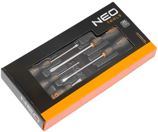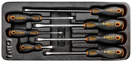 Wkrętaki płaskie NEO (nr ref. 84-231) Grot wkrętaków wykonany jest z wyjątkowo wytrzymałej stali S2. Końcówki robocze grota zostały poddane obróbce cieplnej, dzięki czemu uzyskano odpowiednią twardość i odporność na zgięcia 56 HRC. Wkrętaki posiadają magnetyczne, wzmocnione końcówki. Trójgraniasty kształt uchwytu z wyprofilowanym oparciem dla kciuka zmniejsza obciążenie dłoni podczas pracy i ułatwia uzyskanie optymalnego momentu obrotowego. Dwumateriałowy uchwyt zapobiega ślizganiu się w dłoni, odporny jest na działanie chemikaliów, olejów i smarów. Narzędzia dostarczane są w praktycznej wytłoczce z tworzywa, pasującej do szuflad szafek narzędziowych NEO 84-221 i 84-222. Jakość narzędzia potwierdzona certyfikatem TÜV i 25-letnią gwarancją producenta. Marka NEO spełnia oczekiwania profesjonalistów.
