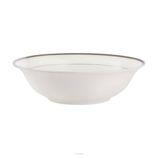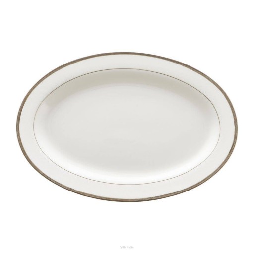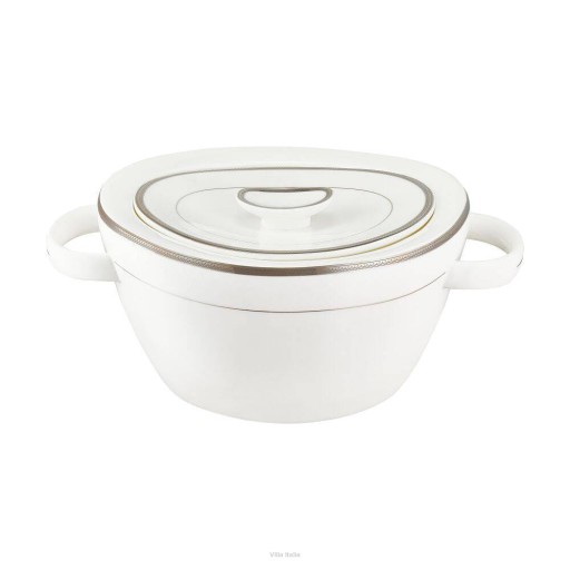 Zestaw obiadowy Chloe wykonany jest z cienkiej i delikatnej porcelany kostnej w mlecznym odcieniu bieli. W zestawie obiadowym znajdują się: talerze, 2 duże półmiski owalne, 2 salaterki i pojemna waza. Waza w swej podstawie ma kształt owalny. Naczynia mają klasyczne formy i ciekawe zdobienia. Każdy element serwisu obiadowego Chloe dekorowany jest drobnym, geometrycznym wzorem w kolorze białym. Wzór podkreślono platynowymi obwódkami. Szerszą z nich zdobi dodatkowo subtelny, szary wzór przypominający cienki sznurek. Cała dekoracja nadaje naczyniom wytworny charakter, dzięki czemu zastawa Chloe będzie wspaniałą oprawą rodzinnych uroczystości, czy innych specjalnych okazji.