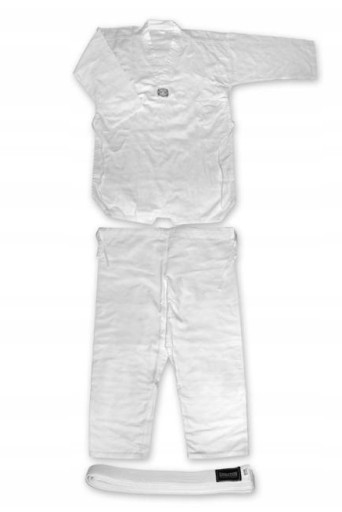 Komplet do taekwondo, składający się z bluzy, spodni i białego pasa.