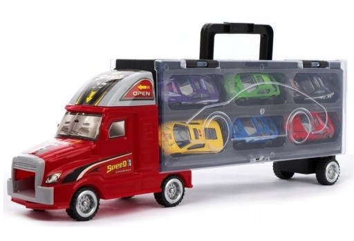 Z taką ilością kolorowych resoraków wspaniała rozrywka gwarantowana! Przezroczyste boki naczepy otwierają się, umożliwiając umieszczenie mniejszych pojazdów w boksach. Przetransportujesz je w każde wybrane miejsce, a jakby tego było mało zabierzesz wszędzie, gdzie tylko zechcesz ze sobą. Ciężarówka posiada bowiem wygodną rączkę do przenoszenia.