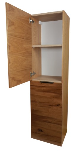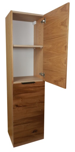 Nowoczesny, podwieszany słupek łazienkowy z systemem cichego domykania, wewnątrz dodatkowe półki (ruchome).