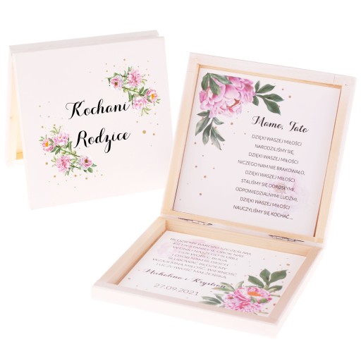 Pudełko drewniane zaproszenie prośba dla rodziców ślub wesele błogosławieństwo piwonie