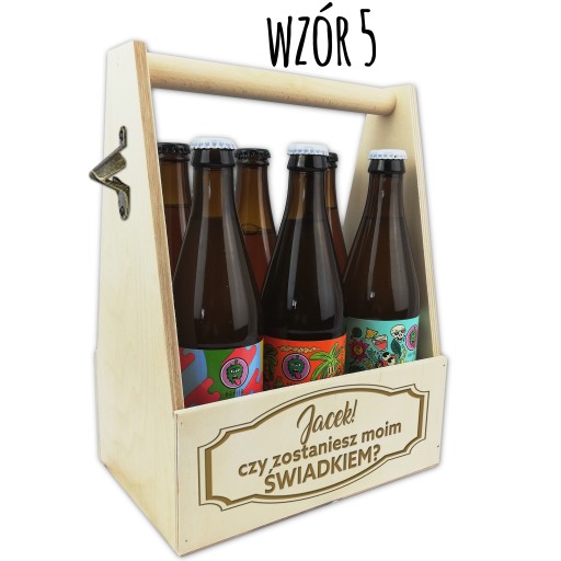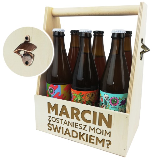 Drewniana skrzynka na piwo z otwieraczem, to oryginalna propozycja prośby o świadkowanie!
