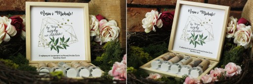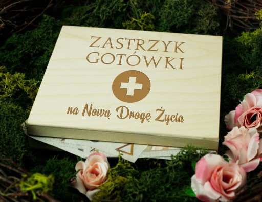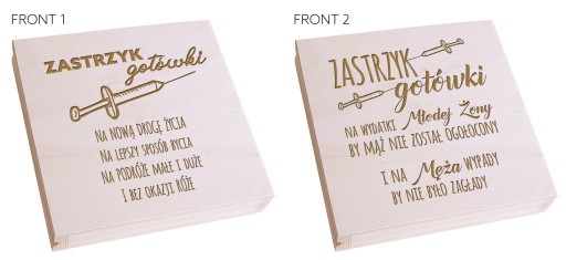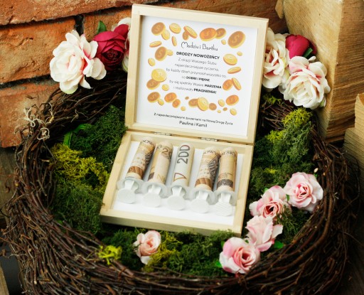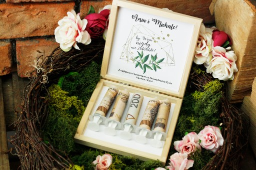 DREWNIANE PUDEŁECZKO NA PIENIĄDZE - OZDOBIONE GRAWEREM Z ZEWNĄTRZ I ŻYCZENIAMI WEWNĄTRZ- ORYGINALNA PAMIĄTKA DLA MŁODEJ PARY + STRZYKAWKI DO OWINIĘCIA BANKNOTAMI