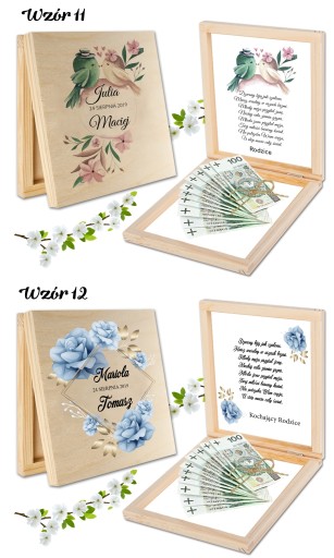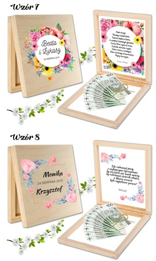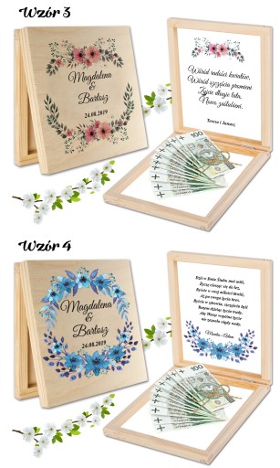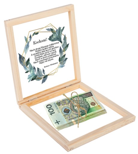 DREWNIANE PUDEŁECZKO NA PIENIĄDZE - OZDOBIONE TRWAŁYM NADRUKIEM UV Z ZEWNĄTRZ I ŻYCZENIAMI WEWNĄTRZ- ORYGINALNA PAMIĄTKA DLA MŁODEJ PARY