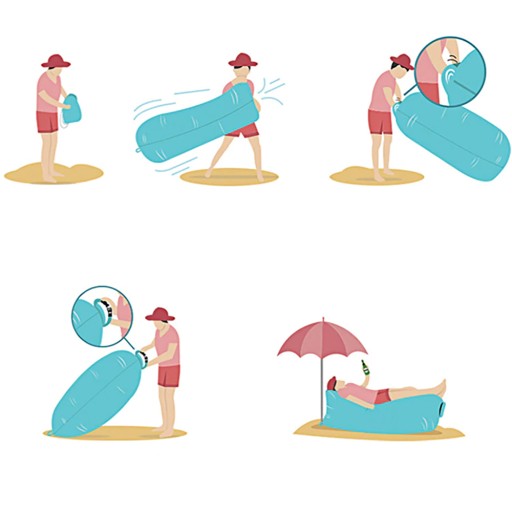 Samo napełnienie sofy jest bardzo proste i nie wymaga użycia jakichkolwiek sprzętów do pompowania, dzięki czemu zdecydowanie zyskuje na funkcjonalności. Aby napełnić swój wypoczynek wystarczy złapać powietrze w każdą z komór, np. poprzez przestąpienie kilku żwawych kroków pod wiatr, by wypełniła się po brzegi. Następnie należy uszczelnić otwór poprzez zwinięcie materiału i zamknięcie klamry.