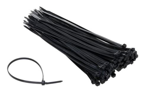 Zestaw jednorazowych, elastycznych, mocnych opasek zaciskowych w kolorze czarnym.