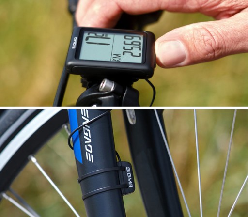 Uchwyt na kierownicę i nadajnik prędkości można zamontować na rowerze za pomocą opasek zaciskowych (w zestawie). Licznik rowerowy odbiera wszystkie potrzebne dane przewodowo.