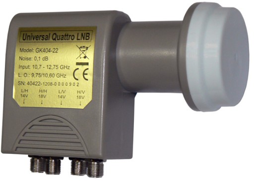 Konwerter quattro do anten satelitarnych dla multiswitchów z podziałem polaryzacji (V/H) oraz pasma (dolne/górne) od 4 do 16 punktów w gotowych multiswitchach lub więcej przy rozwiązaniach kaskadowych.