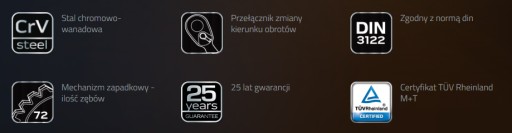 - Materiał mechanizmu zapadkowego: stal chromowo-molibdenowa (CrMo)