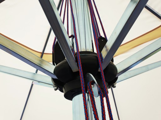 - Wywietrznik ( Komin ) , znajdujący się na górze plandeki zapewnia stabilność parasola przy dużym wietrze