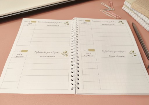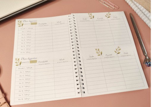 - miejsce na zapisanie planów lekcji, dyżurów śródlekcyjnych, posiedzeń rady pedagogicznej, szkoleń wewnątrzszkolnych i zewnętrznych, spotkań z rodzicami, wycieczek i wydarzeń klasowych,