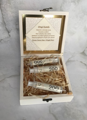 Pudełko zawiera imię solenizanta jak i również osób wręczających prezent. Do wyboru maja Państwo również dużą ilość życzeń urodzinowych. Można przesłać własne.