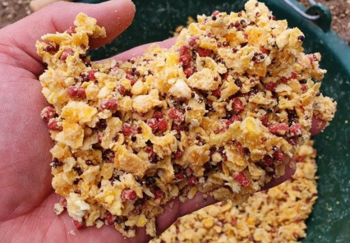 Wystarczy wsypać płatki do wiaderka i zalać wodą, można delikatnie namoczyć, aby można było kleić kule, albo można dodać więcej wody, aby uzyskać smugę zanętową.