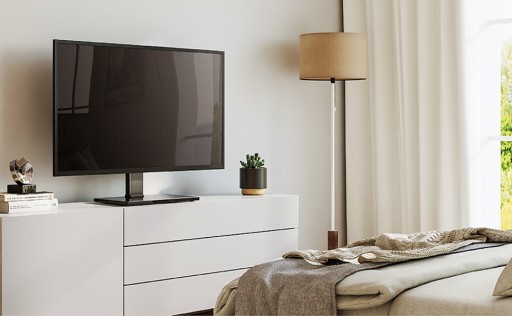 【OBRÓT I REGULACJA WYSOKOŚCI Matryca - Stojak na telewizor można obrócić o 40 stopni w lewo lub w prawo, aby uzyskać szerszy zakres kąta widzenia. Płyta montażowa posiada 3 poziomy regulacji wysokości. Każdą wysokość można regulować o 50 mm, aby spełnić różne rozmiary telewizorów lub wymagania dotyczące wysokości siedziska. Konstrukcja bezpieczeństwa zapobiega upadkowi i przesuwaniu się telewizora