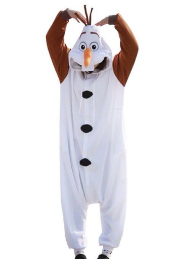 Biało-brązowe kigurumi przedstawiające postać BAŁWANKA OLAFA to doskonały strój na udaną imprezę ze znajomymi, wygodny dres do domu, czy ciepła piżamka na chłodne wieczory! Kigurumi ma wiele zastosowań, dzięki temu, że wykonane jest z wysokiej jakości mikrofibry, która jest ciepła, bardzo miła w dotyku, wytrzymała jeśli chodzi o częste pranie. Z tyłu posiada zamek błyskawiczny, który ułatwia skorzystanie z toalety- nie trzeba ściągać całego kombinezonu. Kaptur posiada imitację głowy Bałwanka OLAFA. Wygodne zapięcia- guziki, luźny krój, ściągacze przy rękawach i nogawkach sprawiają, że w takim kombinezonie będziesz czuć się bardzo wygodnie i swobodnie, ponieważ nie krępuje ruchów. Świetny pomysł na prezent okolicznościowy. Spraw uśmiech najbliższym obdarowując ich kombinezonem BAŁWANKA OLAFA! Na pozostałych naszych aukcjach znajdują się inne rozmiary i modele. Zapraszamy do zakupów!