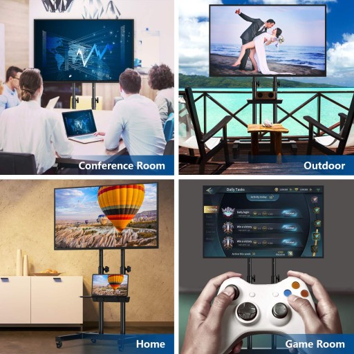 Zalecany rozmiar telewizora: 32 37 39 40 42 43 46 47 48 49 50 55 58 60 65 70 cali Odpowiednie wymiary VESA: 100x100 - 600x400 mm, np. 600x400 / 600x300 / 500x300 / 400x400 / 400x300 / 400x200 / 300x300 / 300x200 / 200x200 / 200x100 /100x100… maks. Nośność: maks. 50 kg TV; 5 kg na talerz Materiał: metal malowany proszkowo Konstrukcja: odchylany o ± 15 ° | 1260-1810 mm z regulacją wysokości | 360 ° rolowany Łatwy w montażu: pakiet zawiera mobilny stojak telewizyjny ze wszystkimi niezbędnymi akcesoriami i instrukcją montażu w języku angielskim Warunki użytkowania: Idealny na wystawy, imprezy, spotkania, prezentacje, lotniska, hole, szpitale, laboratoria, centra handlowe itp.