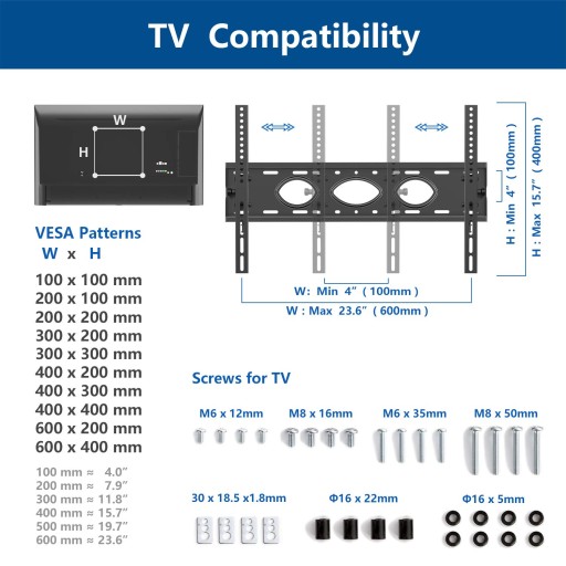 Najpierw sprawdź wagę swojego telewizora. Powinien ważyć mniej niż 50 kg. Po drugie, upewnij się, że telewizor ma cztery otwory montażowe z tyłu, a ten wspornik obsługuje następujące rozstawy otworów na śruby VESA: Od 100 x 100 mm do 600 x 400 mm. (Np. 600x400 / 600x200 / 500x300 / 400x400 / 400x300 / 400x200 / 300x300 / 300x200 / 200x200 / 200x100 / 100x100 ...) Zalecany rozmiar 32 37 39 40 42 43 46 47 48 49 50 55 58 60 65 70 cali