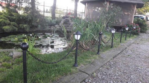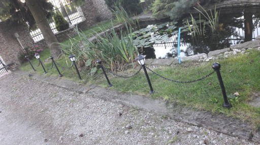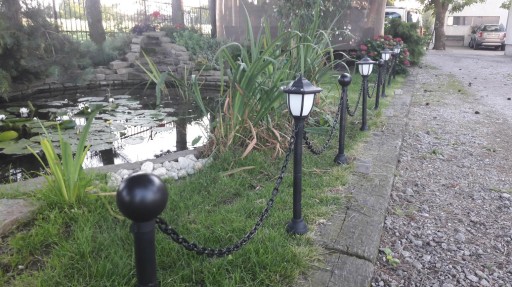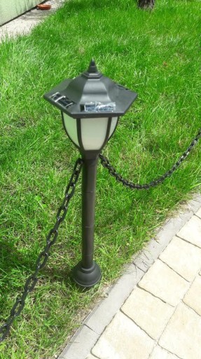 4 stylowe słupki połączone łańcuchem. Dwa z nich u góry mają efektowne lampy solarne z bardzo mocnymi akumulatorami litowymi 600 mAh 1,2V - w lecie mogą świecić całą noc. Kolejne dwa są zakończone pięknymi kulami. Wszystkie są połączone łańcuchem - maksymalny rozstaw: 98 cm. Możemy więc mieć 3 metry antycznego płota, który oprócz walorów estetycznych, może po prostu chronić nasz trawnik przed zadeptaniem, Lampy solarne są wyposażone aż w 4 panele solarne - naładują akumulator w każdym ustawieniu, nawet w pochmurny dzień. Wysokość słupków - 71 cm.