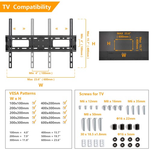 - Kompatybilność - stojak na telewizor oferuje miejsce na 27-60 cali LED, LCD, OLED, telewizor plazmowy itp.; VESA: 100 x 100 mm - 600 x 400 mm, pasuje do LG, Sharp, Panasonic, HISENSE, Samsung, Sony, TCL itp.