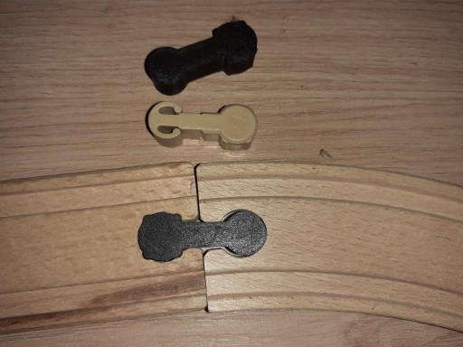 Jedna strona z wypustkami wchodzi na wcisk, gładka luźno łączy drewniane tory.