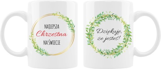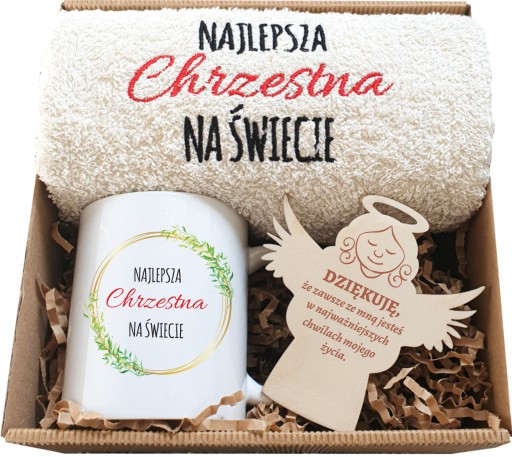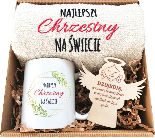 Nadruk na kubku, haft na ręczniku oraz grawer na drewnianym aniołku jest stały i nie podlega modyfikacjom (dla motywu 1CHŚ - Najlepsza Chrzestna na świecie, dla motywu 2CHŚ - Najlepszy Chrzestny na świecie).