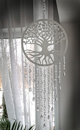 Łapacz wykonany jest ze sklejki 3mm. Kolor biały, matowy. Możliwe widoczne naturalne usłojenie drewna. Wielkość drewnianej obręczy to 30 cm. Mandala ozdobiona akrylowymi kryształkami.